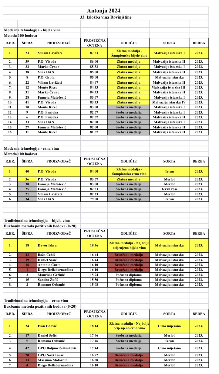 U kategoriji Profesionalnih proizvođača za bijela vina prvu nagradu s ukupno 87,33 bodova za Malvaziju istarsku berbe 2023. dobio je Viliam Lavižati te tako osvojio šampionsku medalju s najviše bodova u kategoriji. U kategoriji Profesionalnih prozvođača crnih vina zlatnu šampionsku medalju dobio je P.O. Vivoda s ukupno 84 bodova za Teran. U kategoriji Proizvođača hobista za bijela vina najviše bodova i zlatnu medalju dobila je Malvazija istarska od Davora Iskre, a u istoj skupini hobista u kategoriji za crna vina najviše bodova osvojio je Ivan Udovič za crno miješano vino.