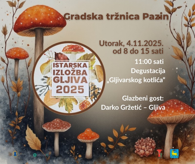 Atraktivna vođena izložba, besplatna degustacija „Gljivarskog kotlića“, stručno vodstvo i glazbeni nastup Darka Gržetića Gljive savršeno će se uklopiti u ambijent Gradske tržnice u Pazinu. Događanje je odlična pozivnica svim aktivnim beračima, rekreativcima, ljubiteljima prirode i obiteljima da provedu ugodan jesenski dan u Pazinu – uz dobru hranu, glazbu, zanimljivo druženje i nova znanja.