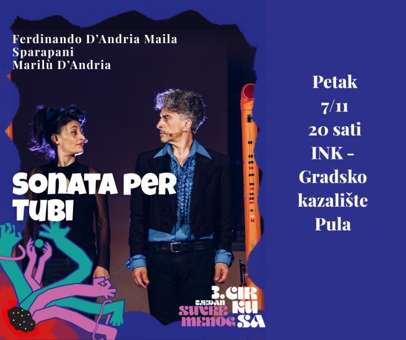 Talijanski duo Nando i Maila donosi „Sonatu per Tubi” – jedinstvenu predstavu koja spaja cirkus i glazbu u „cirkusu izuma”. Predmeti i rekviziti postaju instrumenti, a kroz domišljatost i tehnologiju nastaje koncert koji prelazi od Rossinija i Beethovena do Pink Floyda i Rolling Stonesa.