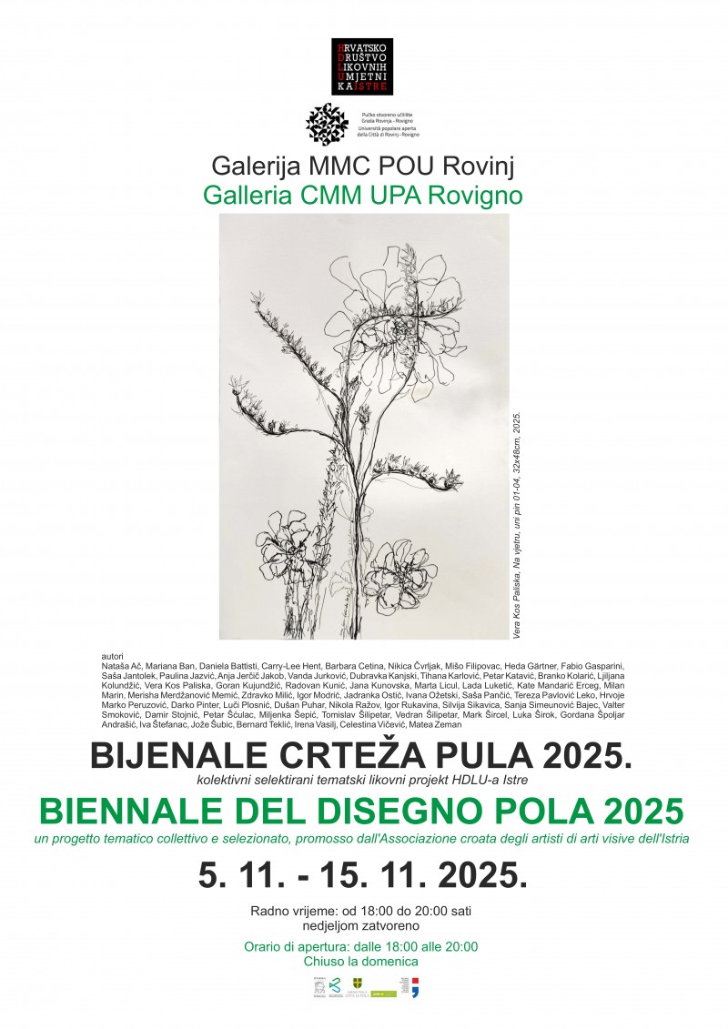 Svi zainteresirani pozvani su na otvorenje izložbe odabranih radova s Bijenala crteža Pula 2025. koji će biti izloženi u galerijskom prostoru Pučkog otvorenog učilišta Rovinj - MMC Rovinj. Otvorenje izložbe održat će se u srijedu, 5. studenog, u MMCu Rovinj, Trg brodogradilišta 5, u 18 sati.