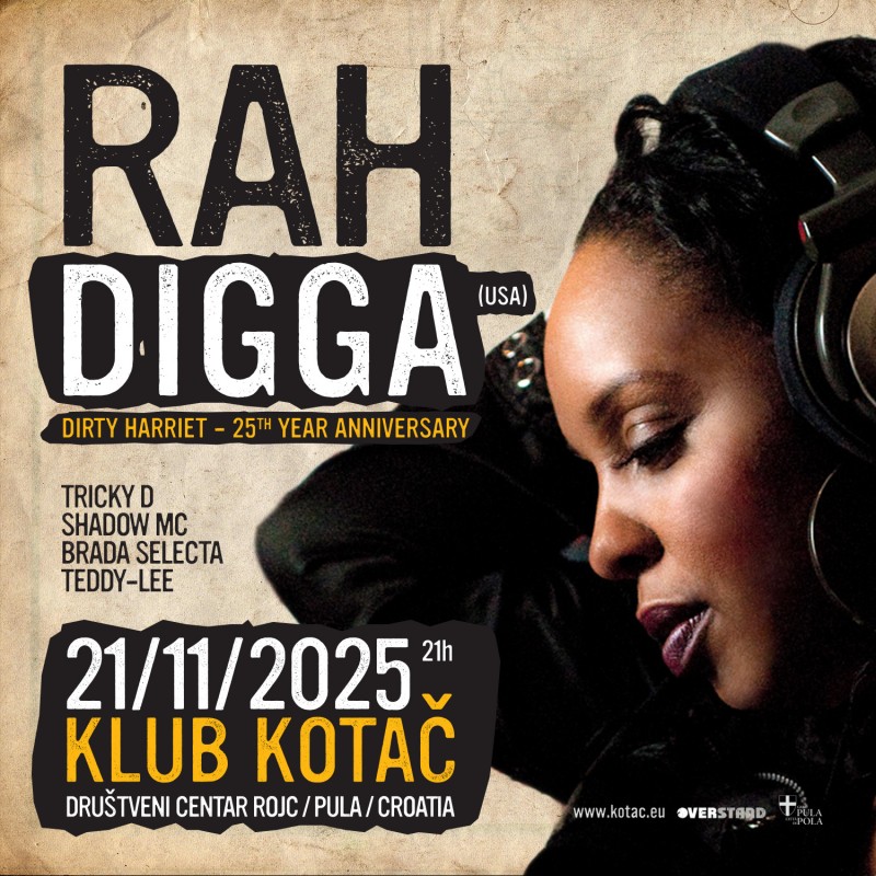Legendarna američka reperica Rah Digga stiže u Pulu! Povodom 25. godišnjice svog debitantskog albuma Dirty Harriet, nastupit će 21. studenog 2025. u 21 sat u Klubu Kotač (DC Rojc, Gajeva 3, Pula) – i to u sklopu jedinog koncerta na Balkanu.