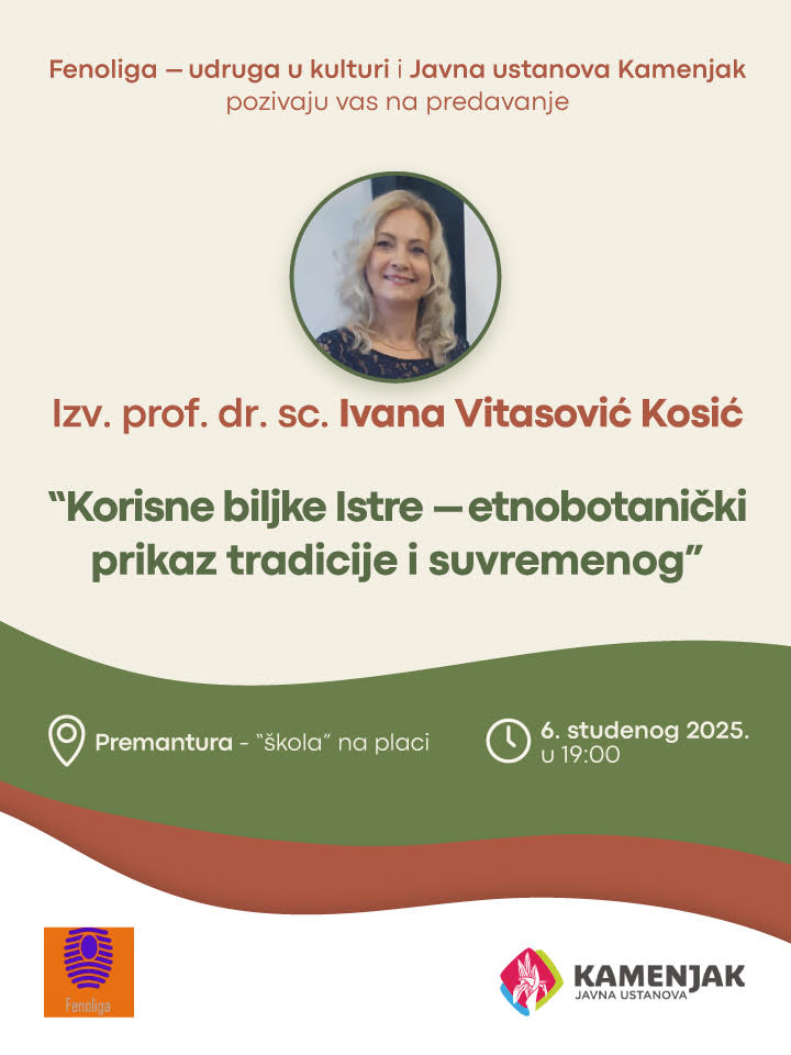 Udruga u kulturi Fenoliga i Javna ustanova Kamenjak pozivaju sve zaljubljenike u prirodu, tradiciju i znanost na predavanje „Korisne biljke Istre“ koje će održati izv. prof. dr. sc. Ivana Vitasović Kosić u četvrtak, 6. studenog 2025. u 19 sati, u prostoru „Škole“ na placi u Premanturi. Ulaz je slobodan.