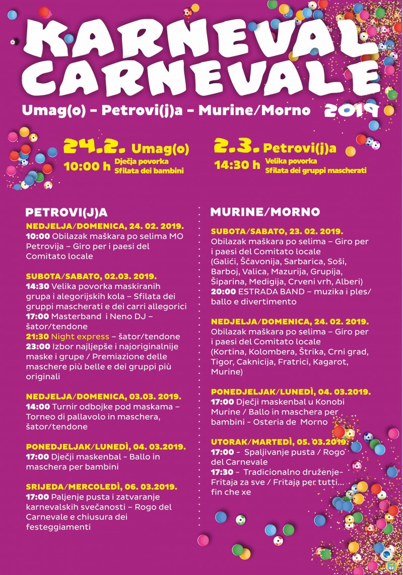 Tradicionalni obilazak maškara po selima za predviđen je za 23. veljače i 24. veljače, u organizaciji MO Murine te MO Petrovija. U Murinama je 23. veljače u večernjim satima predviđena muzika i ples uz Estradu Band.