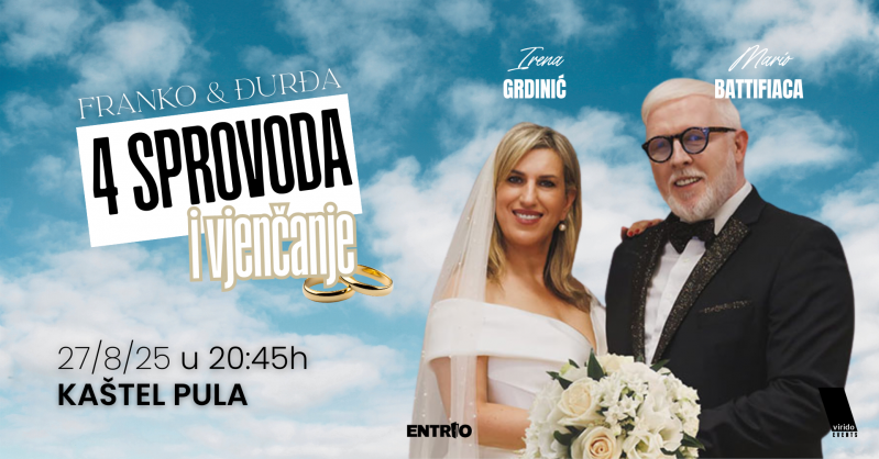 Nastavak najpopularnije predstave naših krajeva „Casabianca“ ili točnije, nove zgode i nezgode bračnog para Đurđe i Franka u novoj predstavi „4 Sprovoda i vjenčanje“ vidjeti će i ponovno nasmijati se do suza i publika na pulskom Kaštelu. Predstava će se odigrati u srijedu, 27. kolovoza u 20,45 sati, a ulaznice se mogu kupiti preko Entrio.hr i u Tisak medija centrima.