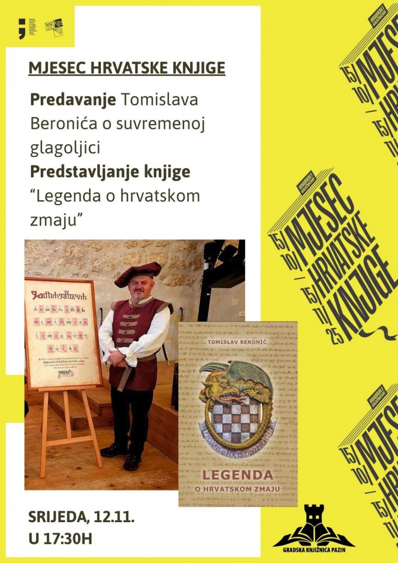 Povodom Mjeseca hrvatske knjige, Gradska knjižnica Pazin ugostit će Tomislava Beronića, hrvatskog književnika i glagoljaša. Susret s autorom održat će se u srijedu, 12. studenoga, u 17:30 sati u prostoru Gradske knjižnice Pazin. Tomislav Beronić održat će predavanje o suvremenoj glagoljici te predstaviti svoju knjigu „Legenda o hrvatskom zmaju“.