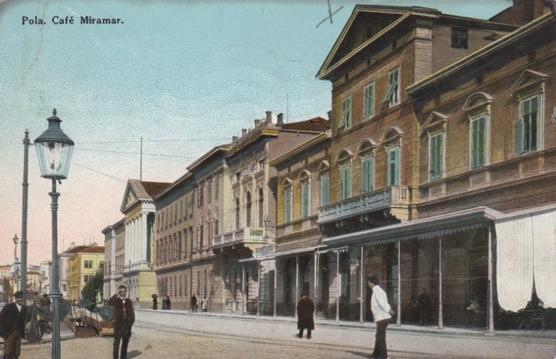 Slika 1. S lijeva na desno: zgrada Admiraliteta, Društvo i Caffe Pro Concordia, Caffe Miramar (Virtalna zavičajna zbirka GKČ Pula)