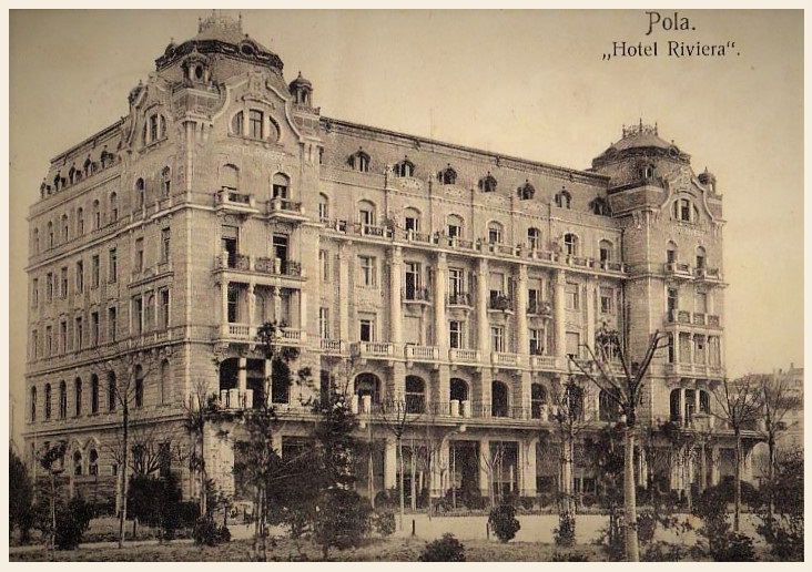 Na rubu grada, tamo gdje se željezna pruga susreće s mirnom uvalom, izronio je 1909. godine Hotel Riviera – kameni cvijet secesije, okrunjen kulama koje stražare nad lukom. Ona nije bila samo hotel; bila je obećanje luksuza onima koji su u Pulu dolazili s mirisom dalekih putovanja u kosi. Dok se sunce polako utapa u Jadran, njezina se fasada presijava poput bisera. U njezinu kavanu, zaklonjenu teškim baršunom i mirisom egzotičnog cvijeća, ulazi se s tihim strahopoštovanjem. Tu zrak titra od glazbe uživo – violine plaču bečke valcere, dok klavir odgovara ritmom tršćanskih luka. Pod visokim stropovima miješaju se sudbine: Visoki oficiri u besprijekornim plavim odorama ovdje skidaju rukavice, odlažu sablje i na trenutak zaboravljaju na disciplinu brodskih paluba. Diplomati iz Beča i Berlina, skriveni iza oblaka dima skupih havana, u poluglasu rješavaju pitanja koja kroje kartu Europe. Gosti iz inozemstva, u krinolinama i s čipkastim suncobranima, promatraju kroz prozor panoramu brodogradilišta, osjećajući se kao da su na samom rubu civiliziranog svijeta, a opet u njegovom najfinijem krilu. Caffè Riviera bila je pozornica na kojoj se svake večeri igrao komad o sjaju i prolaznosti. Uz zvuk kristalnih čaša i prigušeni smijeh, u njoj se slavio život koji je mirisao na kolonijalnu robu, skupi konjak i jadransku sol. Bila je to Pula u svom najotmjenijem izdanju – kozmopolitska, gorda i neponovljivo lijepa u sutonu jednog carstva.