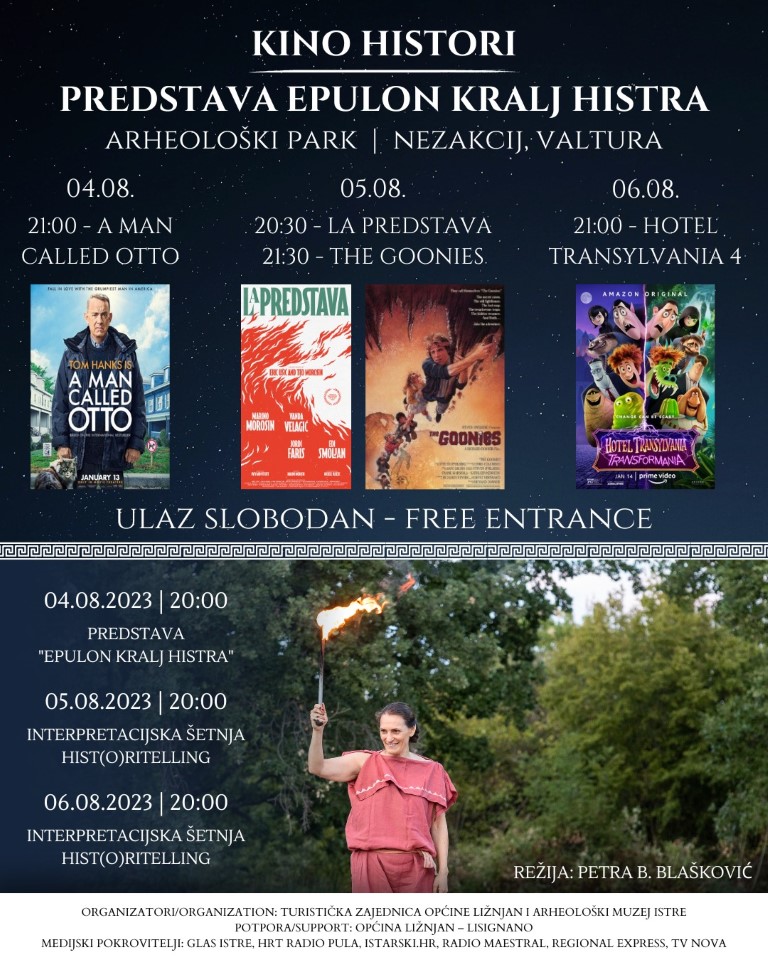 Mistična atmosfera Nezakcija idealna je pozornica za veličanstvenu predstavu o kralju Histra, Epulonu koji je, kao i njegov narod, doživio dramatičnu sudbinu i postao trajno nadahnuće istraživačima, znanstvenicima i umjetnicima. Čarobni štapić inspiracije Histrima dotaknuo je magistricu glume i lutkarstva, dramsku glumicu, iskusnu redateljicu i vrsnu interpretatoricu baštine, Puljanku Petru B. Blašković koja je adaptirala tekst i režirala predstavu "Epulon - kralj Histra" koja će se odigrati u petak, 4. kolovoza u 20 h, a za njom će uslijediti i prva projekcija Kina Hist(o)ri.