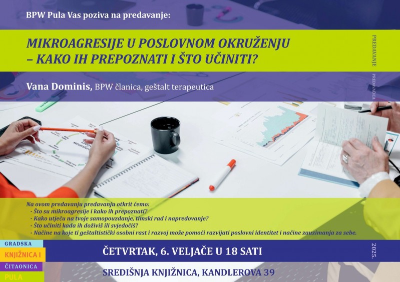 "Vana Dominis, geštalt terapeutica i članica BPW-a Pula, održat će u dvorani Gradske knjižnice i čitaonice Pula u četvrtak, 6. veljače 2025. predavanje Mikroagresije u poslovnom okruženju – kako ih prepoznati i što učiniti?