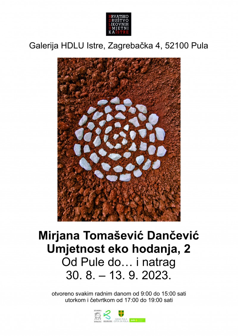 U srijedu, 30. kolovoza u 20 sati, u Galeriji HDLU Istre u Puli otvorit će se samostalna izložbena prezentacija Mirjane Tomašević Dančević - Umjetnost eko hodanja 2, od Pule do ... i natrag. Projekt će predstaviti Eugen Borkovsky kao kustos, a izložbu će otvoriti predsjednik HDLU-a Istre, Milan Marin.