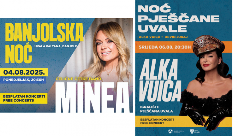 I za njezin će nastup ulaz biti besplatan, a organizaciju oba događaja potpisuju Općina Medulin i medulinska Turistička zajednica.