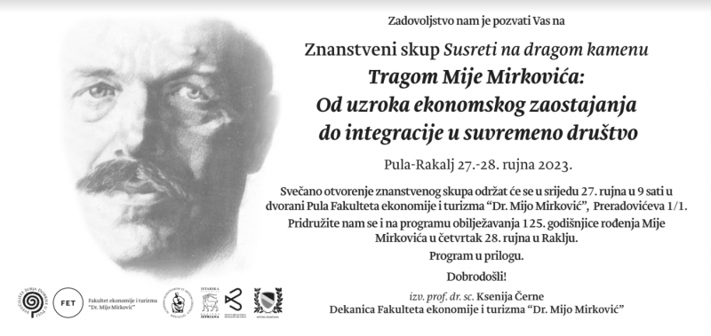 Znanstveni skup Susreti na dragom kamenu „Tragom Mije Mirkovića – Od uzroka ekonomskog zaostajanja do integracije u suvremeno društvo” održat će se u Puli i Raklju, 27. i 28. rujna 2023. pod pokroviteljstvom Hrvatske akademije znanosti i umjetnosti, Razreda za društvene znanosti.