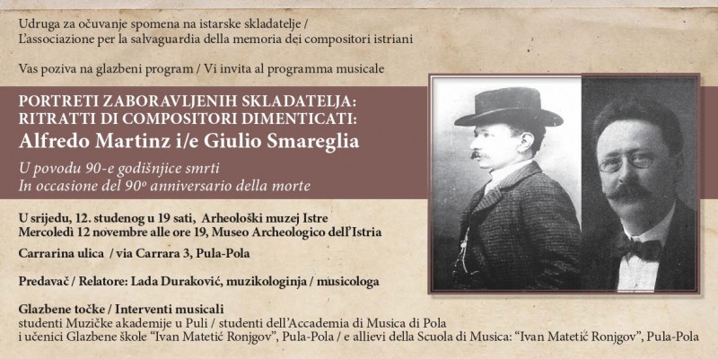 Povodom 90. obljetnice smrti Giulia Smareglie i Alfreda Martinza, dvojice istaknutih istarskih skladatelja, Udruga za očuvanje spomena na istarske skladatelje organizira koncert 'Portreti zaboravljenih skladatelja', koji će se održati u Arheološkom muzeju Istre.