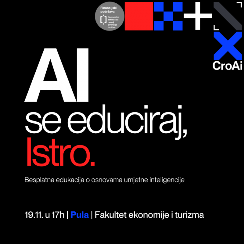 Hrvatska udruga za umjetnu inteligenciju (CroAI) poziva sve zainteresirane na besplatnu edukaciju "AI se educiraj", koja će se održati 19. studenog 2024. s početkom u 17:00 sati, na Fakultetu ekonomije i turizma u Puli. Edukacija je posebno prilagođena potrebama nastavnika, profesora, ravnatelja i nenastavnog osoblja, ali je otvorena i za širu javnost.