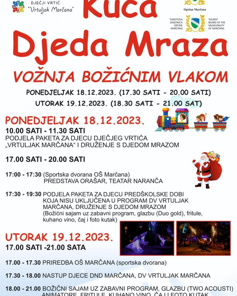 Predstavljamo vam ''Kuću Djeda Mraza'' – zabavni blagdanski program za cijelu obitelj. Kroz dvije večeri, na lokaciji kod vrtića u Marčani očekujte čarolijom obavijen Božićni program s pregršt atrakcija i predstava, za velike i male, uz živu glazbu Dua Gold i Two Acoustic, topli čaj, kuhano vino i fritule u grijanom šatoru, prigodno dekoriranim foto kutkom/scenom za stvaranje najljepših uspomena s profesionalnim fotografom Valterom Zancom. Tu je i vožnja vlakićem kroz Marčanu, kao i prodajno-izložbena ponuda lokalnih rukotvoraca s poklon idejama.