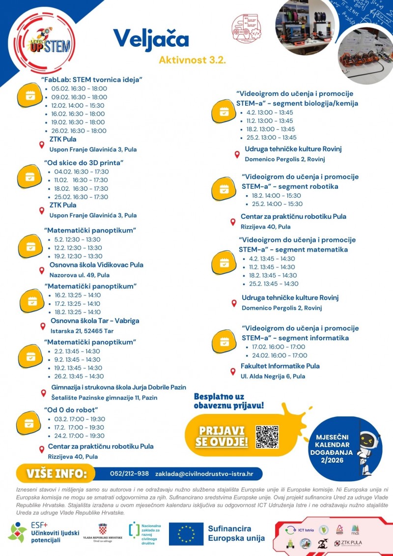 Tijekom veljače 2026. godine u sklopu projekta održat će se sljedeće besplatne STEM radionice: