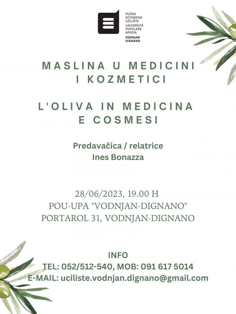 U srijedu, 28. lipnja, s početkom u 19.00 sati, POU-UPA „Vodnjan-Dignano“ ugostit će Ines Bonazzu, koja će održati predavanje na temu „Maslina u medicini i kozmetici“. Predavanje je namijenjeno maslinarima, ali i svim zainteresiranima, a otkrit će kako proizvesti raznu kozmetiku od maslinovog ulja te kako koristiti maslinov list u medicinske svrhe.