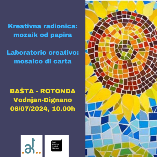 Druga ovogodišnja radionica, na rasporedu u subotu, 6. srpnja, s početkom u 10.00h, održat će se u Bašti u Vodnjanu. Na radionici ćemo izrađivati mozaike od papira, a koristit će se novinski papir, kolaž i akrilne boje. Polaznici će sami odabrati temu i svojom kreativnošću je prenijeti na podlogu. Kao sredstva za rad koristit ćemo škare i ljepilo za papir.