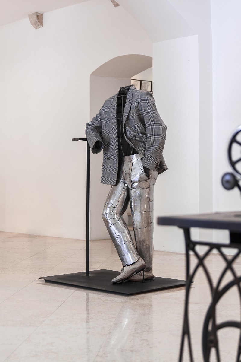 …Metalne skulpture Marka Človeka smještene su u ambijentu koji simulira krojačku radionicu originalnim uporabnim predmetima poput krojačkog stola, krojačkog metra, glačala ili šivaćeg stroja. Autor ovom kiparskom grupom otvara novo poglavlje svog rada koje se sada bazira na kontrasnim impostacijama materijala i upotrebi ready made predmeta u kiparskom i ambijentalnom kontekstu. Oblačeći dijelove metalnih skulptura odjevnim predmetima, Marko konfrontira toplinu tekstila hladnoći ispoliranog metala te stvara začudne kompozicijske i kolorističke akcente koje njegove nove skulpture čine maštovitim i inovativnim objektima profinjene i originalne naracije gotovo naturalističkog predznaka.