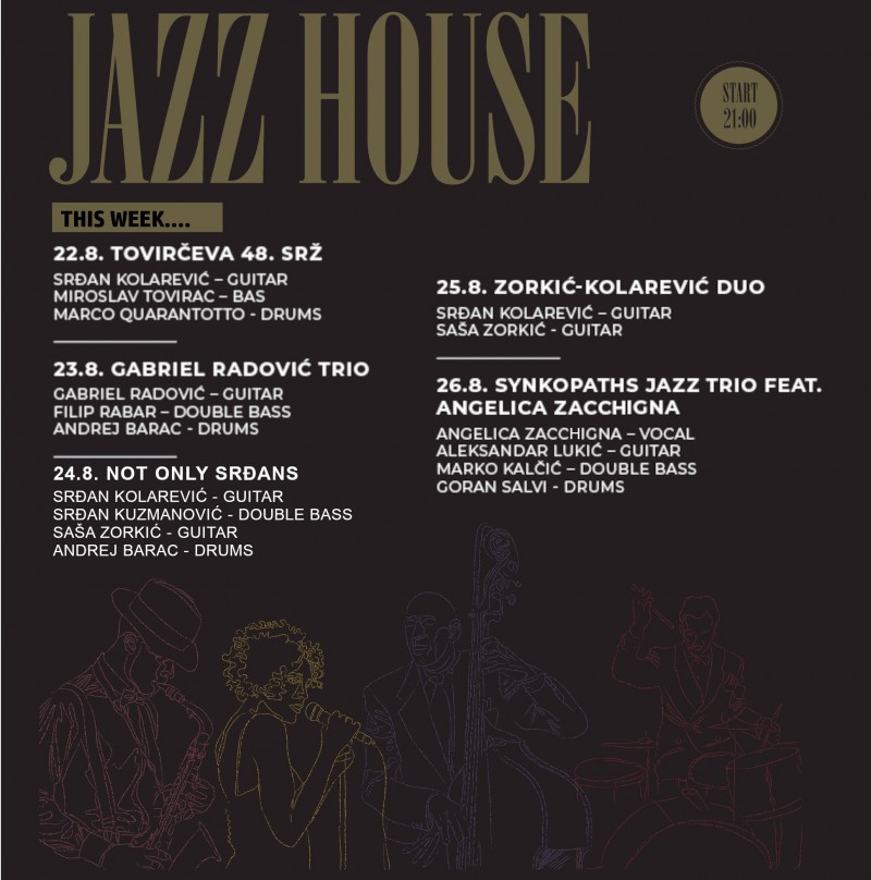U subotu 26.8. još ćemo jednom imati priliku poslušati rovinjski „Synkopaths jazz trio“ uz gošću, pjevačicu Angelicu Zacchignu. Nakon dojmljivog prošlotjednog nastupa evo još jedne prilike da ih još jednom ugoste u Jazz House-u. Uz Angelicu slušati ćemo Aleksandra Lukića na gitari, Marka Kalčića na kontrabasu i Gorana Salvija na bubnjevima.