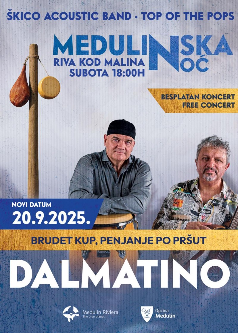 Samo tjedan dana kasnije, Medulin će ponovno biti središte zabave. Odgođena Medulinska noć održava se u subotu, 20. rujna, od 18 sati, također na rivi kod Malina. Program uključuje natjecanje u kuhanju brudeta Brudet kup, tradicionalno penjanje po pršut na pal (stup), nastupe bendova Škico Acoustic Band i Top of the Pops, a vrhunac večeri bit će besplatan koncert popularnog sastava Dalmatino.