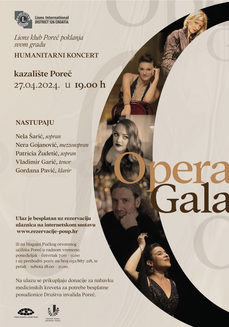 U subotu, 27. travnja, Lions klub Poreč organizira humanitarni koncert „Opera Gala“, uz želju da okupljeni u kazalištu Poreč daju i svoj humanitarni doprinos. Na koncertu će prisutni imati priliku uživati u predivnim glasovima izvođača: