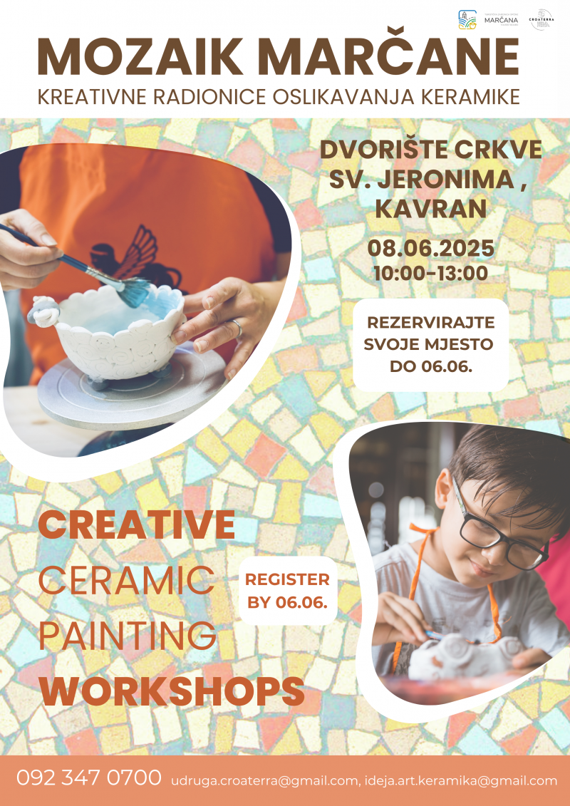 Sudjelovanje je besplatno, no obavezna je prijava na udruga.croaterra@gmail.com ili na broj 092 347 0700, najkasnije do petka 6. lipnja. Radionica je prilagođena svim uzrastima, radovi se oslikavaju engobama – bojama na bazi bijele gline koje su potpuno neškodljive ili akrilnim bojama.