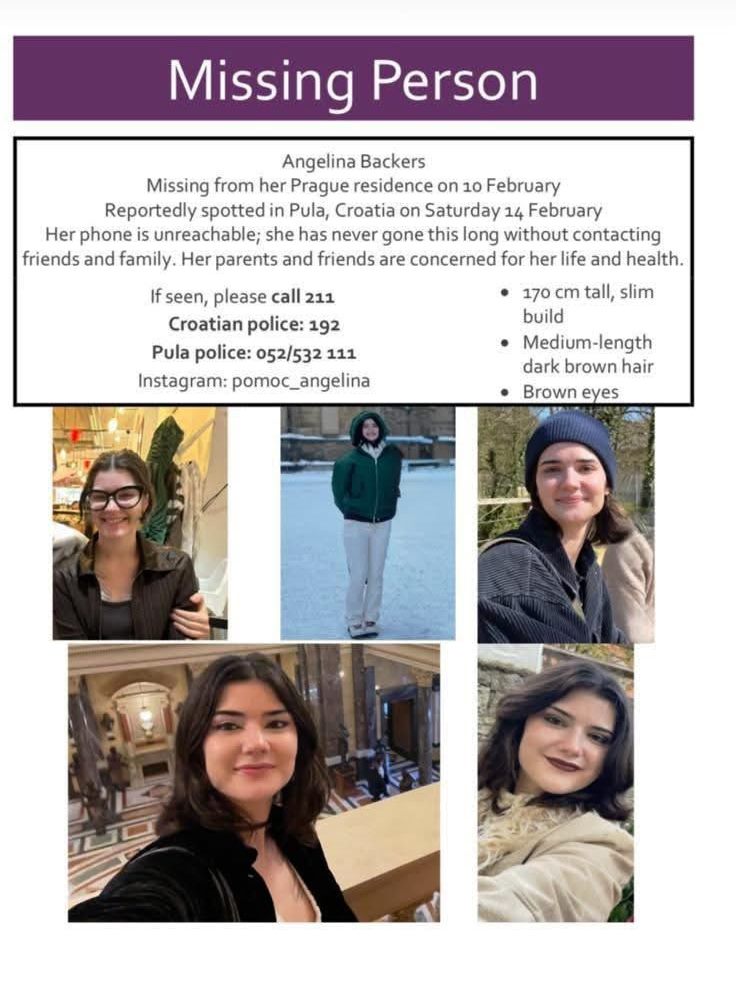 Angelina Backers nestala je 10. veljače iz svog mjesta boravka u Pragu, a prema dostupnim informacijama posljednji put je viđena u Puli 14. veljače. Njezin mobitel je nedostupan, a obitelj i prijatelji zabrinuti su jer se nikada ranije nije tako dugo javljala.
