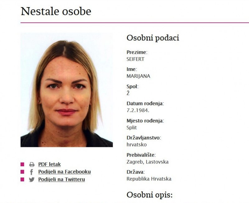 Njezin suprug Karlo Seifert traži pomoć u potrazi preko društvenih mreža, a policija je nestanak stavila na stranice nestali.hr