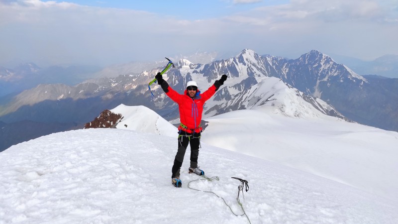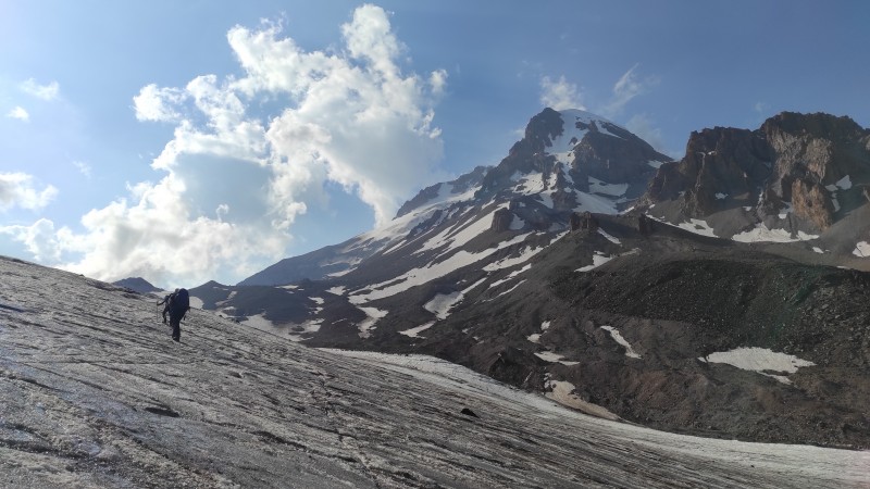 Uspon smo započeli od crkvice Gergeti, preko ledenjaka sve do baznog logora Betlemi na 3700 m. Da ne bude sve savršeno, pobrinuli su se đonovi na gojzama koji su jednostavno otpali! Odspavali smo par sati i u 1 krenuli ledenjakom prema vrhu! Završnih 3 sata uspona išli smo kroz teritorij Rusije! Nakon pukotina, slijedi sve strmiji uspon i bacamo se u navez! Većinu timova smo prešli… Priznajem da sam pomalo bio „na škrgama“, ali ni na tren nisam sumnjao u uspjeh! Zadnjih 150 visinske bio je nagib od oko 50 stupnjeva, i to je ozbiljna stvar kada se priča o visini od 5 kilometara! Laganog koraka, dolazimo na vrh Kazbeka (5054). Ne čestitamo si jer tek smo na pola puta! Ali srce igra, sretan sam. Oko nas posvuda strše ledom okovani vrhovi, i tako u beskraj! Spust smo uspješno odradili, iako je ledenjak pod suncem jako popustio! Za nešto više od 24 sata završavamo turu na pettisućnjaku, zvuči ludo! Nakon relaksacije put smo nastavili preko grada Gori, gdje smo posjetili Staljinovu rodnu kuću. Završna avantura bila je kupanje u Crnom moru. Brojali smo korake po Batumiju, ili od milja istočnom Las Vegasu.