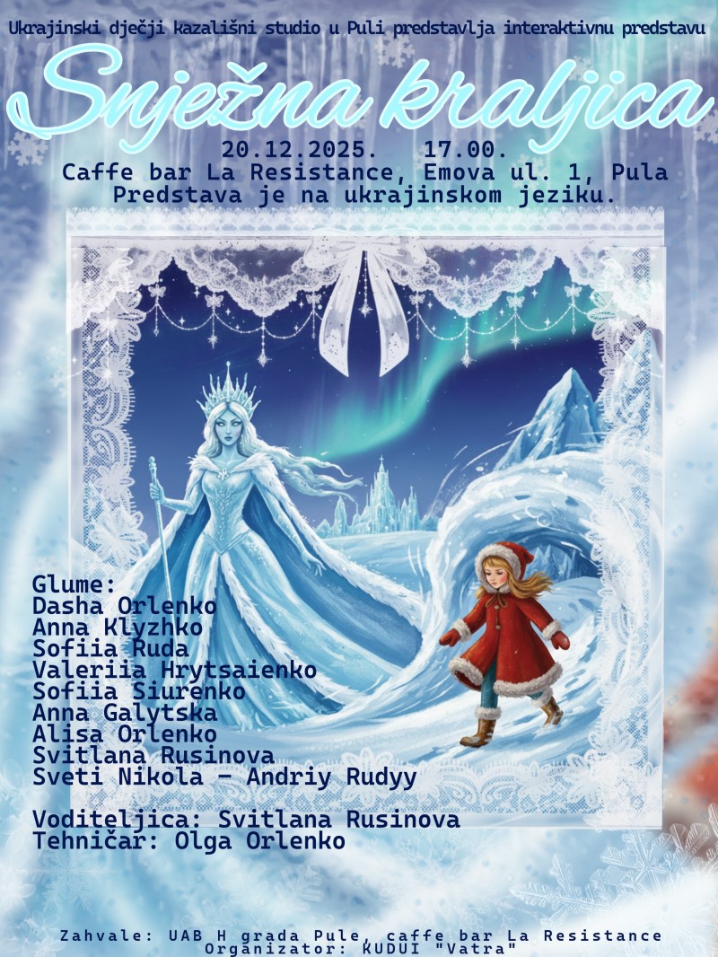 U Puli će se 20. prosinca 2025. u 17 sati, u caffe baru La Resistance (Emova ul. 1), održati premijera novogodišnje interaktivne predstave Ukrajinskog dječjeg kazališnog studija u Puli, koji djeluje u sklopu Kulturno-umjetničkog društva Ukrajinaca u Istri „Vatra”.