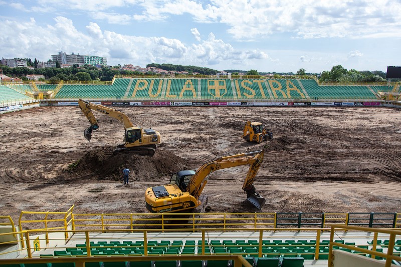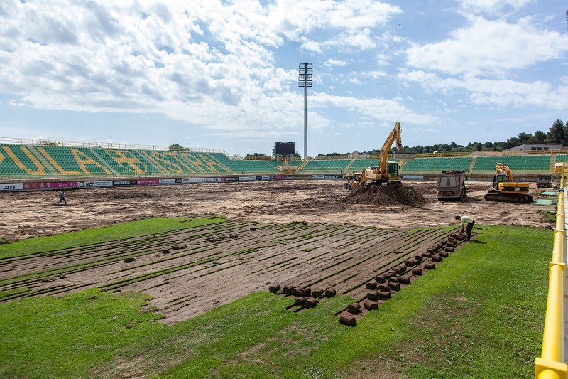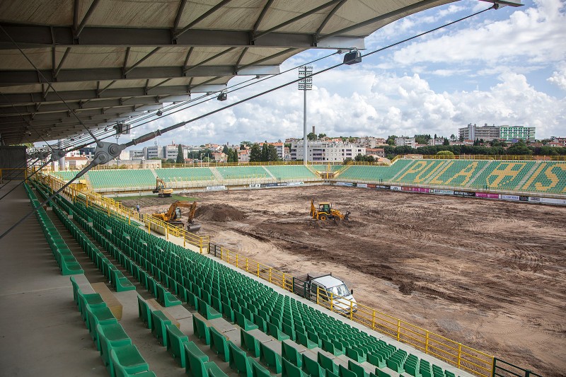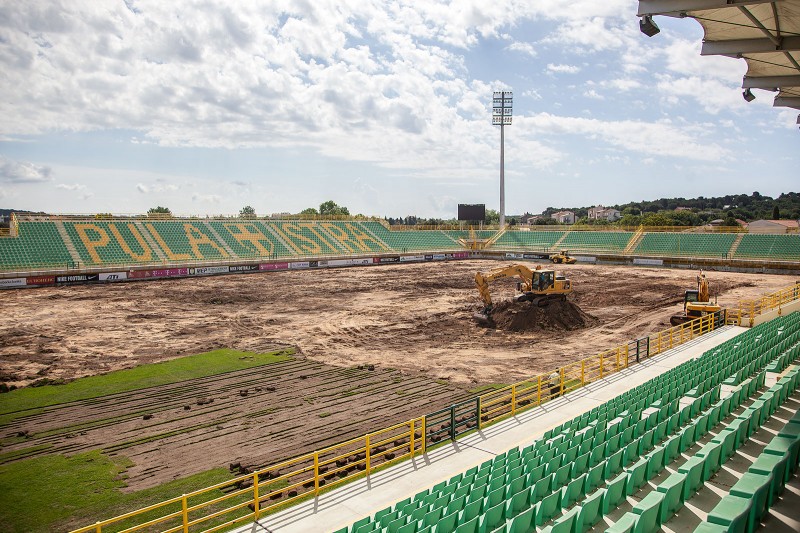 Na pulskoj Drosini intenzivirani su radovi na rekonstrukciji travnjaka koju sufinancira HNS i Grada Pula. Osim što bi Istra 1961 trebala igrati pod upravom novih vlasnika posebni ugođaj bit će i novi zeleni tepih što bi Drosini opravdalo ime "pulska bombonjera". Pogledajte foto zapis našeg reportera Manuela Angelinia i zamislite kako na našem stadionu igra Barcelona; snove vam nitko ne može zabraniti. (NMF/Manuel Angelini)