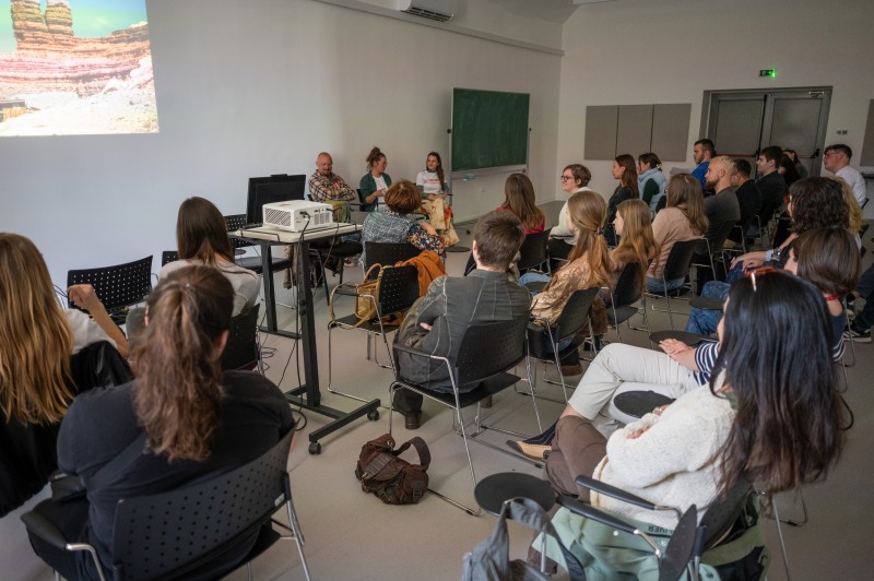 Tijekom jednosatnog i opuštenog razgovora u ozračju dvorane Aula Magna, studenti i njihovi nastavnici mogli su cijelo vrijeme pratiti bogat video-materijal kako bi stekli potpuniji uvid u putovanje života, kako ga Loris i Iva ponosno nazivaju. O samoj organizaciji i pripremi takvog putovanja, ali i nekim drugim popularnim američkim turama poput „glazbene“ Route 61 puno su čuli od Giulije Cecconi iz Rima, vlasnice agencije specijalizirane upravo za slične avanturističke obilaske Sjedinjenih Država.