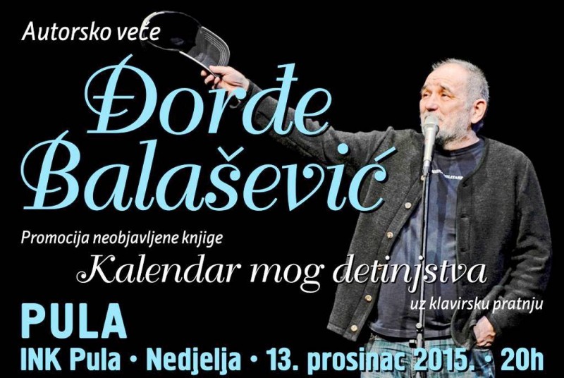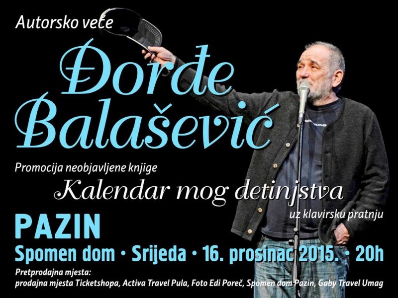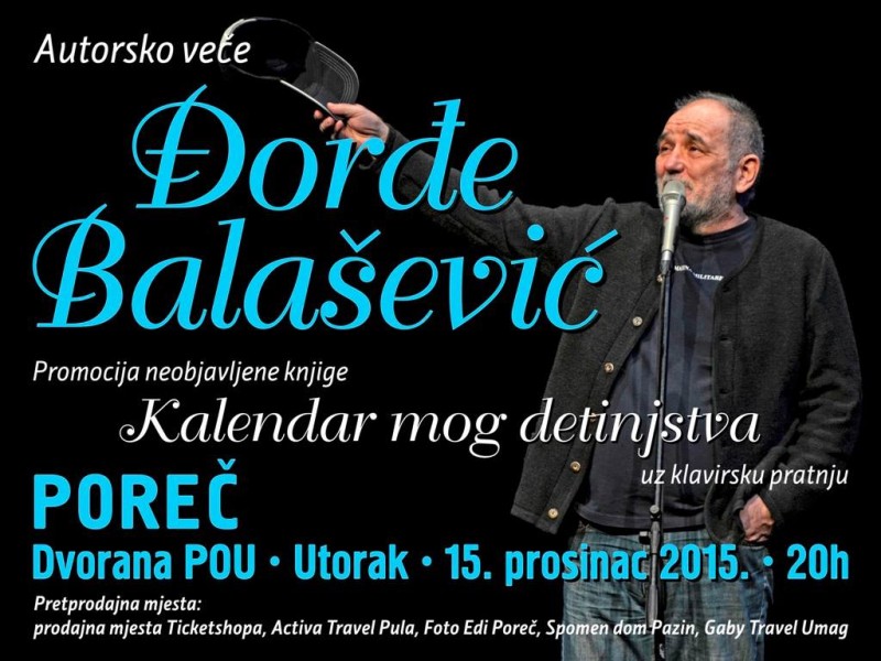 ''Kalendar mog detinjstva'' naziv je autorske večeri Đorđa Balaševića koji će se zbližiti s istarskom publikom u predbožićno vrijeme. Program, u kojem je naglasak na neizdanu knjigu ''Kalendar mog detinjstva'', sadrži Balaševićeve priče iz djetinjstva u kojem publika praktički upoznaje sve likove tj. rodbinu iz njegove rane mladosti, a sve uz već poznatu Đoletovu humorističnu notu koja donosi i salve smijeha u publici. Ovaj jedinstveni stand up nastup, Đorđe Balašević izvodi uz klavirsku pratnju maestra Aleksandra Dujina.
