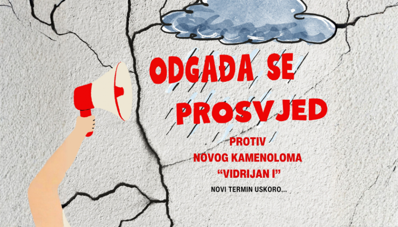 Zbog najavljenog lošeg vremena – kiše i juga – odgađa se prosvjed protiv planiranog kamenoloma “Vidrijan I”, koji se trebao održati sutra, 30. listopada u 16 sati ispred postojećeg kamenoloma ''Vidrijan''.