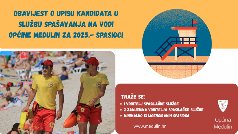 Ovom obavijesti Općina Medulin iskazuje interes da za potrebe Službe spašavanja na vodi tijekom 2025. godine (od 05.06. – 15.09.) angažira: