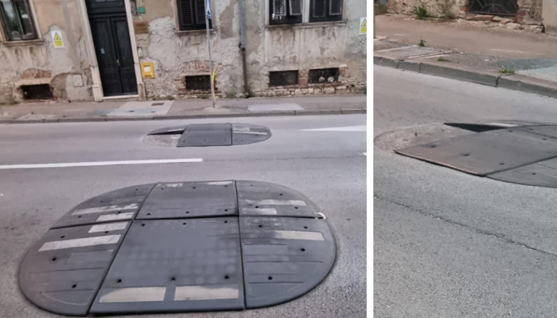 Vozači koji svakodnevno prolaze Marulićevom ulicom u Puli već neko vrijeme svjedoče stanju u kojem se nalaze takozvani „ležeći policajci“ – prometni uspornici koji bi trebali služiti sigurnosti, a sada više nalikuju opasnim preprekama.