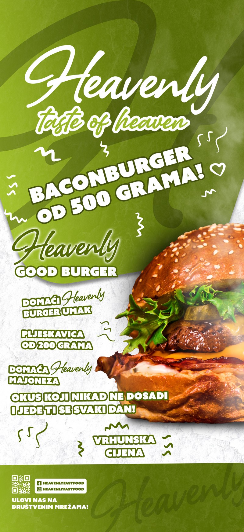 Iako je fast food, Heavenly se trudi dokazati da brzina i kvaliteta mogu ići ruku pod ruku. Svaki dan rade s dnevno svježim mesom i kruhom iz lokalne pekare, a vlastiti umaci koje pripremaju unikatnog su okusa i zaokružuju cijelu priču na najbolji mogući način.