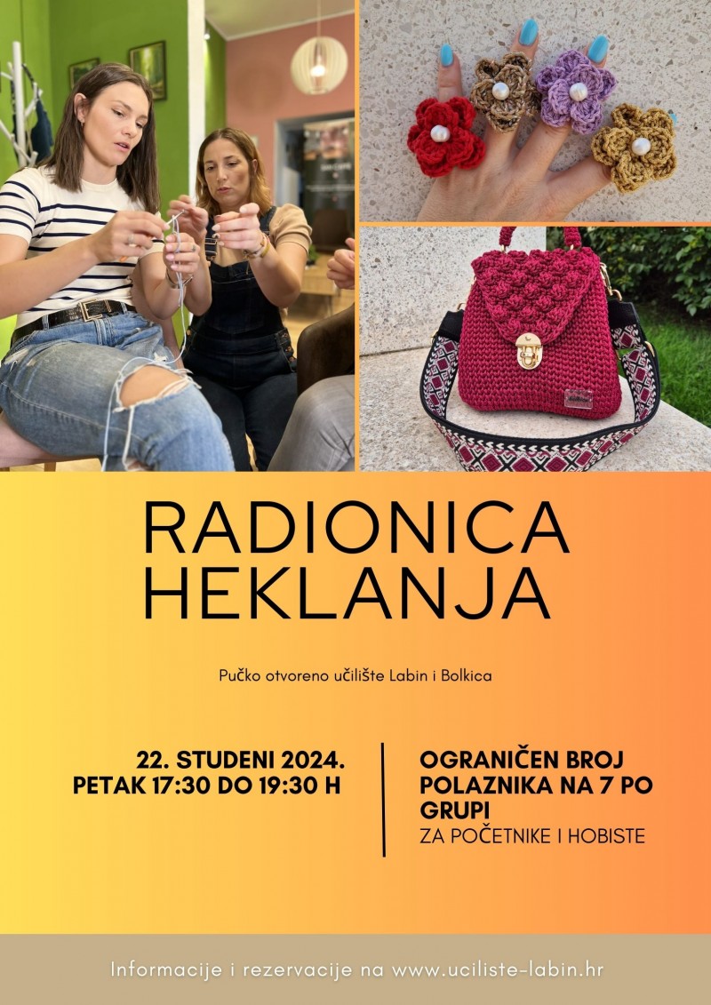 U ovoj jednodnevnoj radionici polaznici mogu usvojiti vještinu heklanja. Heklanje ili kukičanje je proces kojim se izrađuje tkanina uz pomoć konca ili vune. Heklanje je savršena razbibriga i potiče kreativnost.