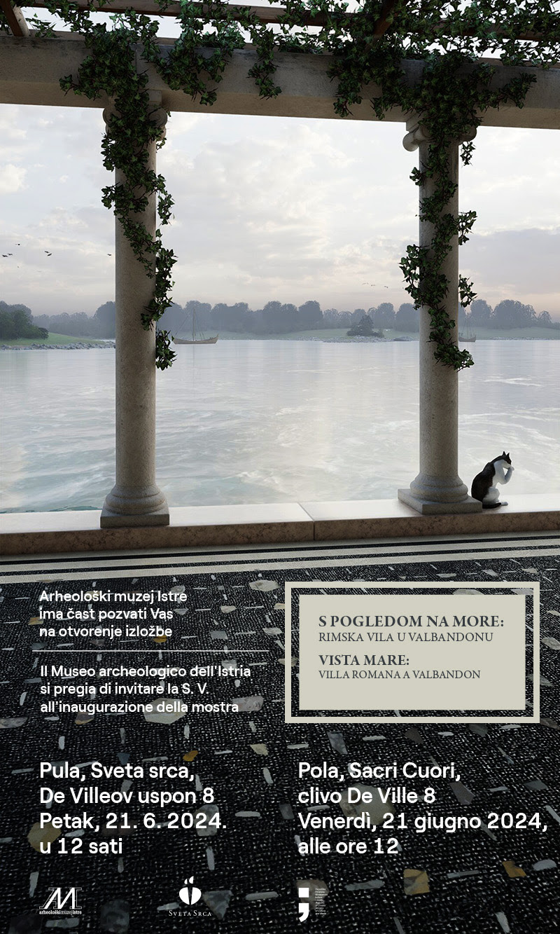 Arheološki muzej Istre poziva vas na otvorenje izložbe 'S pogledom na more: Rimska vila u Valbandonu' autorica Aleksandre Mahić Sinovčić i Ide Koncani Uhač, u petak, 21. lipnja 2024. u 12 sati, u Muzejsko-galerijskom prostoru Svetih srca u Puli. Izložba će trajati do 10. studenog 2024.