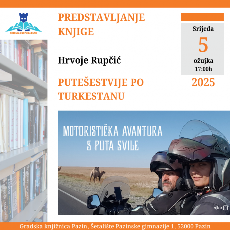 Svi zainteresirani su na predstavljanje knjige "Putešestvije po Turkestanu" autora Hrvoja Rupčića, koje će se održati 5. ožujka 2025. u 17 sati u Gradskoj knjižnici Pazin.