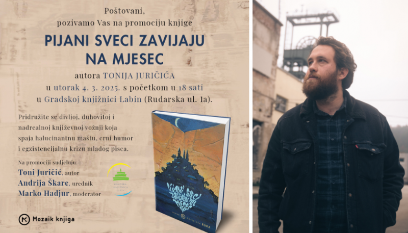 Gradska knjižnica Labin i nakladnička kuća Mozaik knjiga sa zadovoljstvom vas pozivaju na predstavljanje novog romana našega sugrađanina Tonija Juričića „Pijani sveci zavijaju na mjesec“.