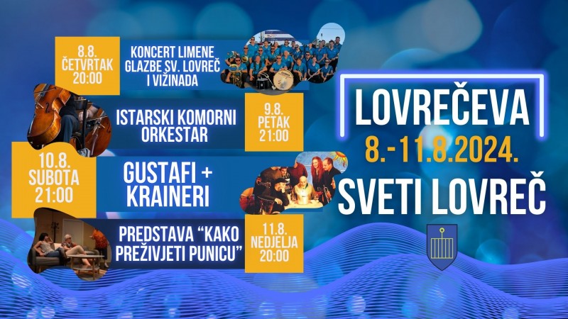 Subota, 10.08., dan je same Lovrečeve, i kao takav, obiluje raznovrsnim događanjima. Već u 09:00 sati, vješti će lovački strijelci biti na Rušnjaku, pokraj Svetog Lovreča, gdje će se održati turnir u gađanju glinenih golubova. U 10:00 sati započinje najsvečaniji dio proslave Lovrečeve, a to je svečana misa, u sklopu koje će se odviti i procesija prema crkvici svetog Lovre, a koja se nalazi na lovrečkom groblju. Nova sportska uzbuđenja kreću već u 11:00 sati, kada će se najbolji regionalni plivači u Limskom zaljevu boriti za titulu pobjednika plivačkog maratona. Toplo poslijepodnevlje je rezervirano za odmor, siestu ili ugošćavanje prijatelja i rodbine, a „akcija“ počinje pred večer. Tako od 20:00 sati na Gradskom trgu počinje zabava i animacija za klince, a u isto vrijeme na drugom kraju Svetog Lovreča, u galeriji „Placa“ na istoimenom trgu, bit će otvorenje izložbe i svečano proglašenje pobjednika foto-natječaja „PhotoCity 2024“ (tema „Igra“) u organizaciji Kluba amaterske fotografije Sveti Lovreč. S početkom u 20:30 tradicionalnom će promenadom za Lovrečevu limena glazba KUD-a Matka Laginje Sveti Lovreč uvesti Lovrečane i goste u glazbeni program, jer od 21:00 na pozornici na Gradskom trgu nastupaju Kraineri te legendarni Gustafi, a to, pak, znači da će fešta potrajati do sitnih jutarnjih sati!