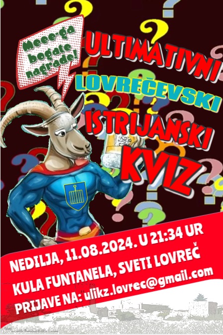 Ovo događanje organizira Udruga za promicanje edukacije u prirodi „Drijade“. Prijaviti se možete putem Google obrasca, na poveznice koje se nalaze na objavama Facebook stranice Udruge „Drijade“ i Lovreština info. A sa zanimljivom satnicom od 21:34 u kuli Funtanela održat će se „Ultimativni lovrečevski istrijanski kviz“. Ovaj će kviz biti ujedno i zadnje, završno kolo ULIKZ lige, a bit će tu mjesta za posebnu proslavu jer kao kviz-koncept „Ultimativni istrijanski kviz“ slavi 5. godišnjicu, a to pak znači da će biti nagrada, ali i zabave za sve! Kvizoljupci i istroznalci svoju ekipu između 2 do 4 člana mogu prijaviti na mail: ulikz.lovrec@gmail.com Osim velike količine zabave, zanimljivih trenutaka i uzbuđenja, treba dodati i kako su sva događanja proslave Lovrečeve besplatna za sve posjetitelje! Općina Sveti Lovreč Vas s veseljem očekuje!