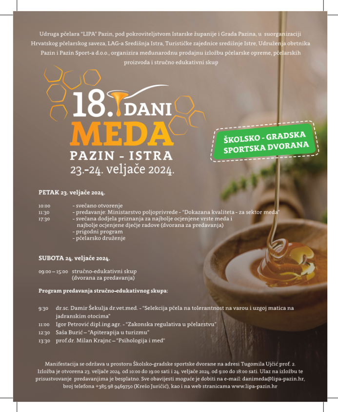 U nastavku pogledajte ovogodišnji program 18. Dana meda u Pazinu koji se održava 23. i 24. veljače.