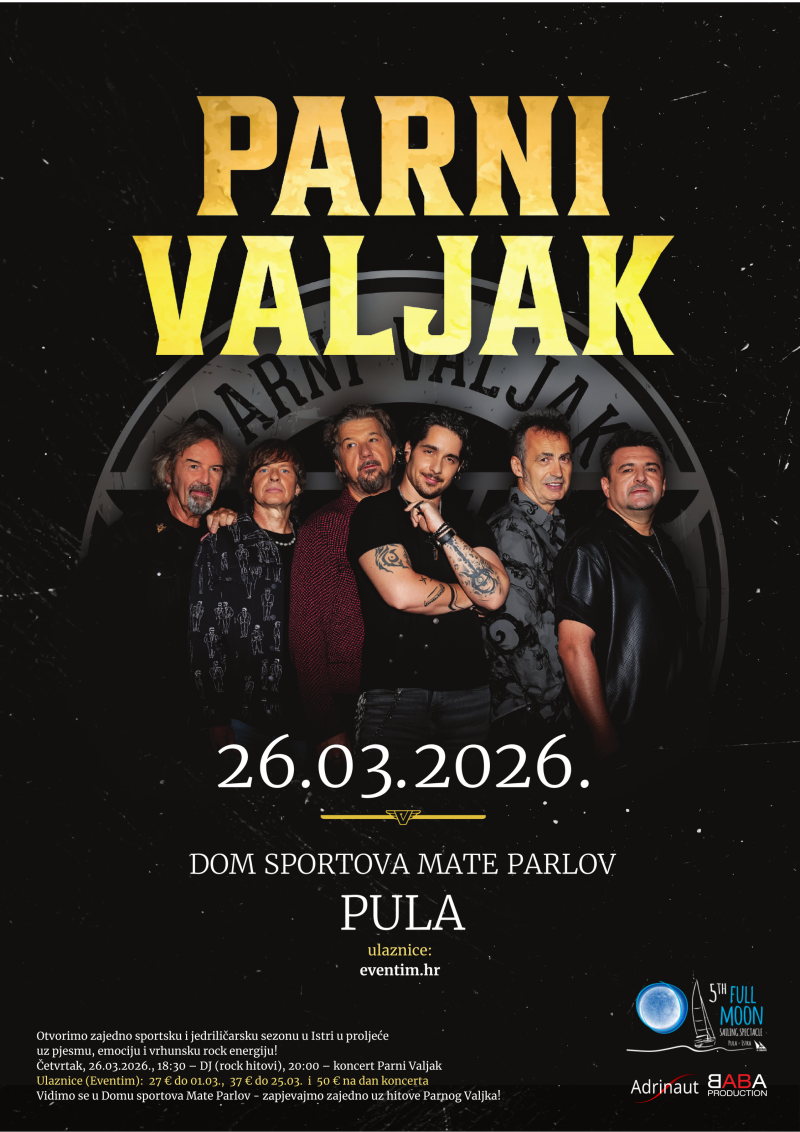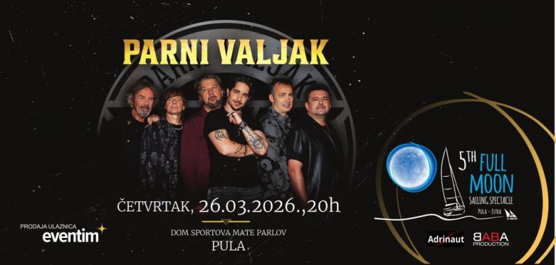 Vrhunac prvog dijela manifestacije slijedi u četvrtak, 26. ožujka 2026., kada će u Dom Sportova Mate Parlov biti održano svečano otvorenje proljetne sportske i jedriličarske sezone krstaša – uz veliki koncert sastava Parni Valjak. Ovaj koncert ujedno je i proslava malog jubileja – pet godina manifestacije Full Moon Sailing Spectacle. Publiku očekuje pravi proljetni spektakl u dvorani u kojoj su se kroz generacije stvarale sportske pobjede i uspjesi. Parni Valjak, jedan od najdugovječnijih i najutjecajnijih hrvatskih pop-rock sastava na sceni od 1975. godine, svojim bezvremenskim hitovima poput „Sve još miriše na nju“, „Jesen u meni“, „Uhvati ritam“, „Zastave“, „Dođi“, „Ugasi me“ i „Moja je pjesma lagana“ okuplja sve generacije i stvara uspomene koje ostaju. Zagrijavanje za koncert počinje u 18:30 sati, dok koncert započinje u 20:00 sati.