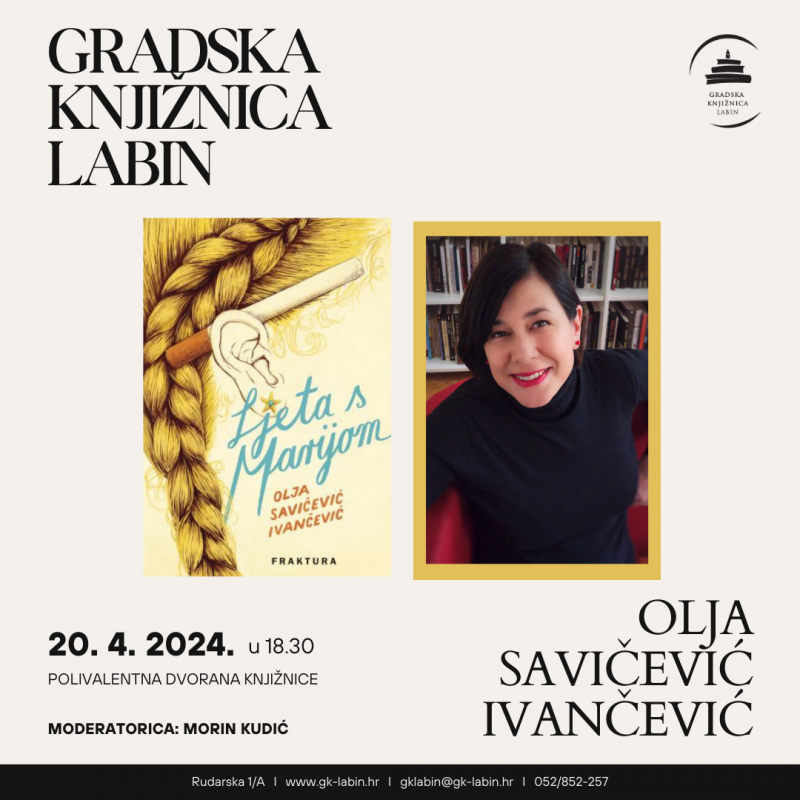 Gradska knjižnica Labin priređuje književni susret s nagrađivanom spisateljicom i pjesnikinjom Oljom Savičević Ivančević i predstavljanje knjige „Ljeta s Marijom“, najčitanijeg romana u istarskim narodnim knjižnicama u prošloj godini.