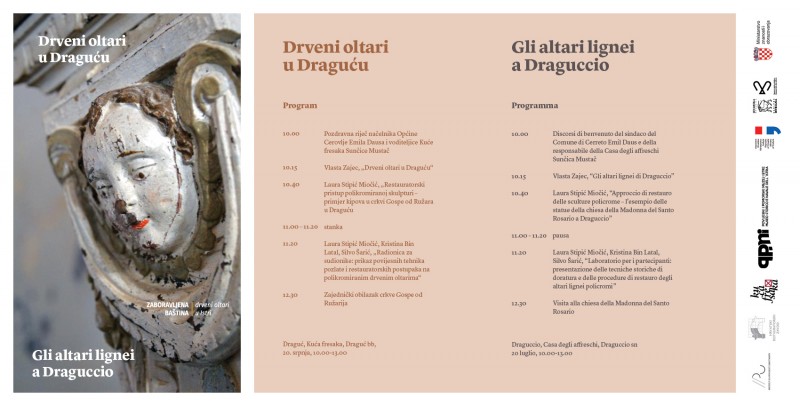 Nakon izlaganja Vlaste Zajec o drvenim oltarima u Draguću te Laure Stipić Miočić o restauratorskom pristupu polikromiranoj skulpturi na primjeru kipova oltara crkve Gospe od Ružara, uslijedit će radionica za sudionike na kojoj će biti prikazane povijesne tehnike pozlate i restauratorskih postupaka na polikromiranim drvenim oltarima (pod vodstvom Kristine Bin Latal, Laure Stipić Miočić i Silva Šarića).