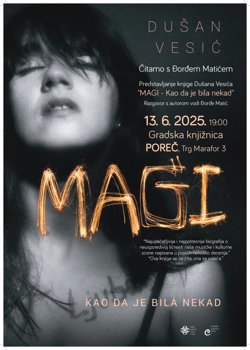 Vrlo zapažena knjiga „Magi – Kao da je bila nekad“ poznatog rock novinara, kritičara i pisca Dušana Vesića bit će predstavljena u Gradskoj knjižnici Poreč (Trg Marafor 3), u petak, 13. lipnja 2025. godine u 19 sati.