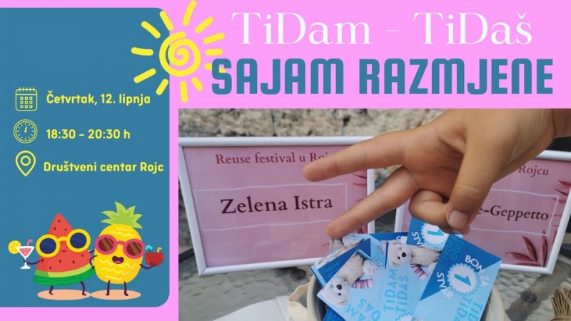 Udruga Zelena Istra i Pula Herculanea pozivaju građane na ljetno izdanje popularnog TiDam–TiDaš sajma razmjene, koji će se održati u četvrtak, 12. lipnja, od 18:30 do 20:00 sati, u unutarnjem dvorištu DC Rojc, ispred radione Re-Geppetto.